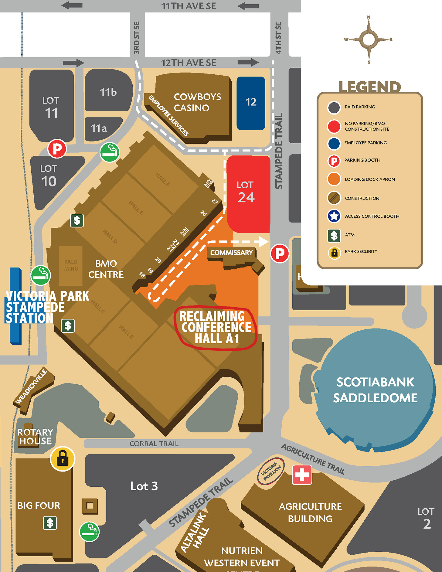 You can take the train to Victoria Park Stampede Station which is directly in front of the BMO Centre or alternatively, you can find parking at the BIG FOUR building Parking Lot 3. See map below.