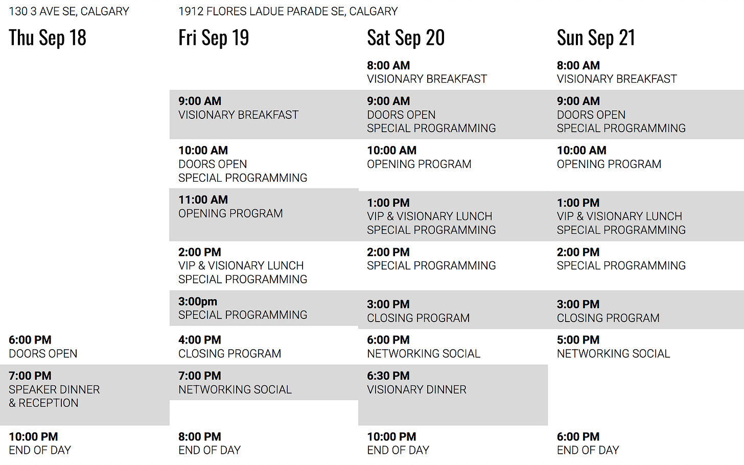 We begin on September 18th with a Dinner and Reception which will be hosted at White Diamond Banquet and Conference Center located at 130 3 Ave SE, Calgary, AB T2G 0B6. Doors open at 6:00pm and dinner will be served at 7:00pm. All times are local to Calgary. If you have not yet made a reservation with us to attend this dinner, please check in advance to ensure we do not exceed venue capacity.